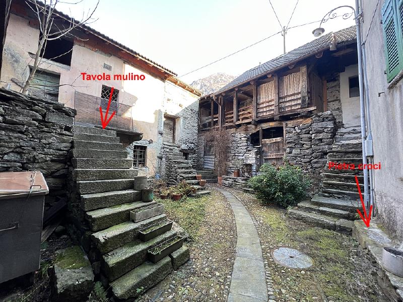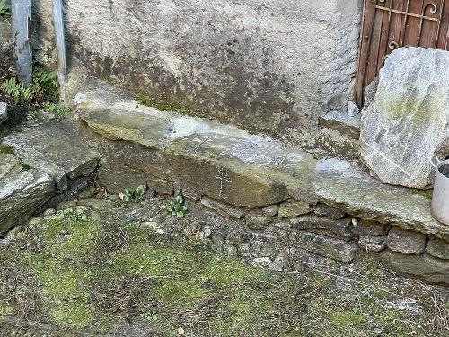 Ad Avegno di Dentro, in Vallemaggia, ho trovato una tavola da mulino (nel modello classico con le sole mediane) incisa sul pianerottolo, alla fine della scalinata che conduce all’ingresso di questa antica cascina semidiroccata. La posizione è tutt’altro che casuale: si tratta di un punto di passaggio e di sosta, proprio davanti alla porta, un luogo dove un tempo si doveva attendere, incontrarsi o semplicemente fermarsi. È la prima volta che mi capita di trovare una tavola da mulino arricchita da una decorazione incisa sopra lo schema classico dei tre quadrati concentrici. Nelle oltre quaranta tavole che ho documentato finora in Ticino, questa è l’unica con un elemento decorativo associato: tutte le altre sono incisioni semplici, essenziali, senza segni aggiuntivi. Questa particolarità fa pensare che qui il mulino non fosse soltanto un gioco inciso per passare il tempo, ma che avesse anche un valore simbolico legato al luogo. La decorazione sopra la tavola potrebbe essere un segno di appartenenza, una forma di protezione dell’ingresso o semplicemente la volontà di impreziosire un punto importante della casa [1].