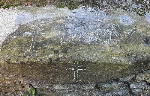 Sempre ad Avegno di dentro ho trovato una pietra lungo un muretto accanto a una casa con inciso due belle croci ed altri segni proprio di fronte alla tavola da mulino e tutte e due vicini alla chiesa.