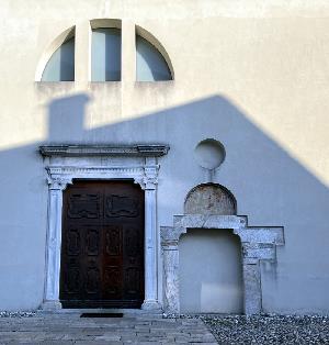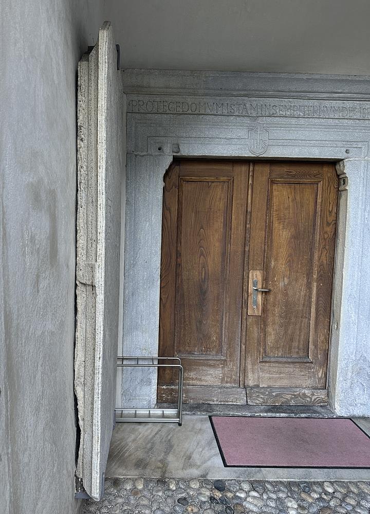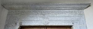 Iscrizione e "Nomina Christi" IHS sull'architrave del portale laterale. La trascrione dell'epigrafe è la seguente: "Protege domum istam in sempiternum dei Israel" è una preghiera invocante protezione divina