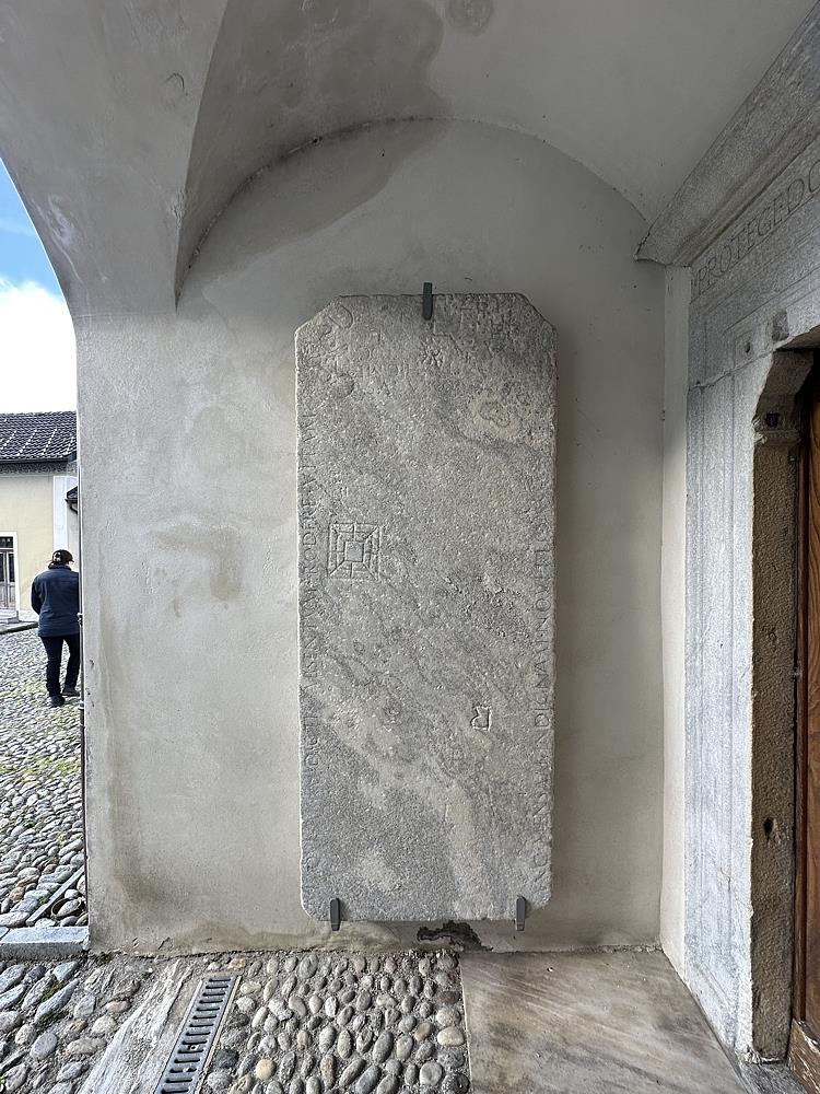 Gottardi inoltre scrive: “Su un lato, nello spazio di spessore della pietra, trovasi, a rilievo, lo stemma della famiglia decuriale dei de Capo. Due sacchi con l’aperura in alto ad indicare la continuità della discendenza”. Questo rilievo come potete vedere dalla mia foto non si riesce piu’ a capire la vera incisione ed è difficile capire se è vero quello che dice Gottardi…Le affermazioni riportate da de Gottardi vanno pertanto considerate come ipotesi personali, non verificabili allo stato attuale delle conoscenze. È inoltre significativo osservare come la lastra non venga menzionata da Gilardoni nel suo inventario delle opere d’arte e delle antichità del distretto di Bellinzona, opera di riferimento per il patrimonio storico-artistico della regione. Questa assenza, unita alla mancanza di studi successivi dedicati specificamente all’oggetto, conferma come la lastra di Lumino non sia mai stata oggetto di un’analisi sistematica né di una reale contestualizzazione scientifica.