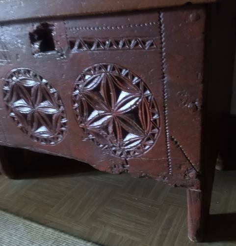 La località non viene specificata perchè l'oggetto è in proprietà privata presso un antiquario. Si tratta di un mobile "gotische truhe engadinese", circa anno 1500, che reca inciso un Alquerque fatto manualmente e grossolanamente. Appare infatti diverso dagli intagli accurati realizzati da mani esperte per impreziosire il mobiletto; questo fatto è molto interessante per la nostra ricerca. Il gioco dell'Alquerque - in detta posizione - non era certamente possibile. Sul mobile sono intagliati allcuni bellissimi simboli come il "Fiore della Vita", molto frequente da trovare in area alpina (detto anche "Sole delle Alpi"), simbolo ubiquitario le cui origini si perdono nella notte dei tempi con significato beneaugurale.
